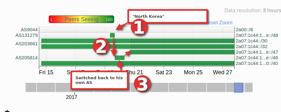 Looking at RIPE Stat and the IPv6 prefix announced it is clear that for a short amount of time, the network operator spoofed his way to make it look like his prefix was being announced by the only ISP in North Korea: